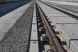 In January 2009, Deutsche Bahn called construction tenders for the subgrade of the ballastless section 2 (track-km 197.889 to km 215.937) and the ballastless section 3 (km 215.937 to km 228.685). Both contracts were to run from June 2009 to the end of April 2012.[50][51] At the end of May 2009, this was followed by the invitation to tender for the contract for the ballastless section 4 (km 251.1 to km 272.1) as well as the ballastless section 5 including the Gröbers junction (km 279.9 bis km 286.9). These contracts were to run from November 2009 to November 2012 (lot 4) and from July 2010 to December 2015 (lot 5).[52][53][54] In July 2009, finally, the integration of the line into the Erfurt junction was tendered, which would be built between December 2009 and December 2010.[55] In July 2011, a contract worth €200 million was awarded for the production of slab track and for 22 kilometres (14 mi) of noise and wind barriers between Erfurt and Gröbers. This work would be completed by the end of 2013.