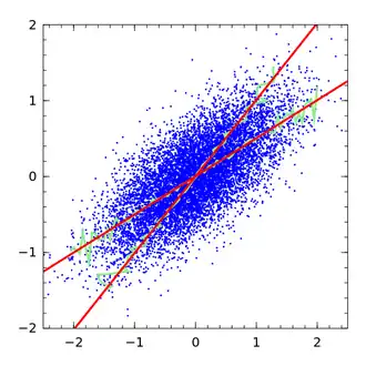 - The geometric mean functional relationship. This treats both variables as having the same reliability. The resulting slope is the geometric mean of the ordinary least squares slope and the reverse least squares slope, i.e. the two red lines in the diagram.[14]
