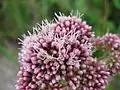 Eupatorium cannabinum is a perennial herb up to 1.75 metres (5.7 feet) tall forming extensive clumps, with the reddish stems covered in small hairs.[7] The leaves are opposite, deeply 3-lobed, occasionally 5-lobed, and have serrated margins.[3][7] It is dioecious, with racemes of mauve flower heads which are pollinated by insects from July to early September. The flowers are visited by many types of insects, and have a generalised pollination syndrome.[13] The flower heads are composed of dense clusters of 2–5 mm long florets of fluffy appearance, and can be pink or purple, or rarely whitish.[7] The fruit is an achene about 2 or 3 mm long, borne by a pappus with hairs 3 to 5 mm long, which is distributed by the wind. The plant over-winters as a hemicryptophyte.[12]