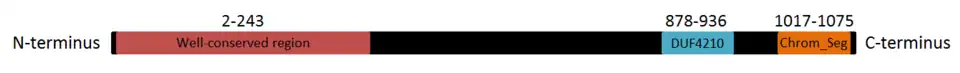 Within the FAM214A protein, there are three well-conserved regions. These include a well-conserved region near the n-terminus of the protein and two conserved domains including the Domain of Unknown Function 4210 (DUF4210) and a Chromosome_Seg domain near the c-terminus.[7] A schematic diagram of these three regions is shown below. The well-conserved region near the n-terminus of the protein is not predicted to contain any known domains or motifs; however, the cleavage site predicted by NetCorona above is located within this region and it is well-conserved in a majority of the proteins orthologous to FAM214A.[27] The two conserved domains located at the end of this protein are the most important portion of the peptide based upon evolutionary history. All organisms in the Ortholog table above except the platypus (which is missing the Chromosome_Seg domain) contain both of these conserved domains within their protein sequence.[7]
