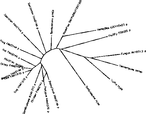 An unrooted phylogenetic tree of 20 orthologs was generated by the CLUSTALW program on Biology Workbench to demonstrate the evolutionary relationship between FAM214A and its orthologs.[31]
