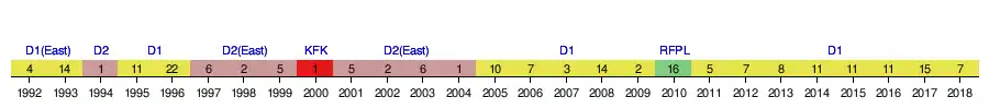 Season Div. Pos. Pl. W D L GS GA P Cup Europe Top Scorer (League) Head Coach