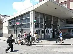 The doors at the northeast end of the platform lead to stairs down to the street level fare control area. A tower and crew offices are at the southwest end. Two elevators and several staircases inside the station house lead to the platform level.[17] A bodega called the "A Line Deli", previously called the "Last Stop Deli", is attached to the station entrance. It was originally a cafe, having been built along with the station in the 1950s.[47][48]