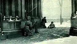 On 23 February O.S. (8 March N.S.), Putilov protesters were joined in the uprising by those celebrating International Women's Day and protesting against the government's food rationing.[40] As the Russian government began rationing flour and bread, rumors of food shortages circulated and bread riots erupted across the city of Petrograd.[40] Women, in particular, were passionate in showing their dissatisfaction with the rationing system, and the female workers marched to nearby factories to recruit over 50,000 workers for the strikes.[41] Both men and women flooded the streets of Petrograd, demanding an end to Russian food shortages, the end of World War I, and the end of autocracy.[38] By the following day 24 February O.S. (9 March N.S), nearly 200,000 protesters filled the streets, demanding the replacement of the Tsar with a more progressive political leader.[38] They called for the war to end and for the Russian monarchy to be overthrown.[40] By 25 February O.S (10 March N.S), nearly all industrial enterprises in Petrograd were shut down by the uprising.[7] Although all gatherings on the streets were absolutely forbidden some 250,000 people were on strike. The president of the Imperial Duma Rodzianko asked the chairman of the Council of Ministers Golitsyn to resign; the minister of Foreign Affairs Nikolai Pokrovsky proposed the resignation of the whole government. There were disturbances on the Nevsky Prospect during the day.[42]
