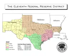 The Federal Reserve Bank of Dallas (informally referred to as the Dallas Fed) is one of 12 regional Federal Reserve Banks that, along with the Federal Reserve Board of Governors in Washington, D.C., make up the Federal Reserve System, the central bank of the United States. The Dallas Fed covers the Eleventh Federal Reserve District, which includes Texas, northern Louisiana and southern New Mexico, a region sometimes referred to as the Oil Patch.[1]