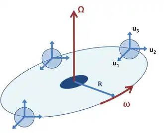 Figure 4: An orbiting coordinate system B similar to Figure 3, but in which unit vectors uj, j = 1, 2, 3 rotate to face the rotational axis, while the origin of the coordinate system B moves at constant angular rate ω about the fixed axis Ω.