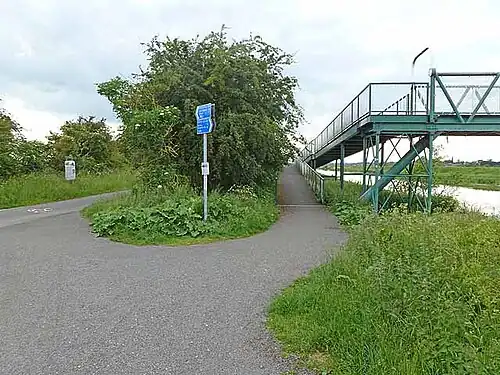 ![]() Five Mile Bridge modern footbridge across the Witham. The cycle track on the left is the old trackbed. The old wooden platforms were a few yards from here. | |||||