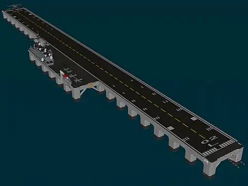 In 1943, a Floating Pontoon Flight Deck, 272 feet wide and 1,810 feet long was constructed by the Seabees at Allen Harbor using a total of 10,291 pontoons. It was towed to a cove in Narragansett Bay, where 140 takeoffs, landings and refuellings were successful in both smooth and rough waters. The pontoon airfield was noted to have advantages over aircraft carriers in lack of requirement for arresting gear for landings, and these could be executed at shorter time intervals. Tests showed that damage from four 100-pound bombs exploding on the floating deck did not interfere with flight operations and could be easily repaired.[4]