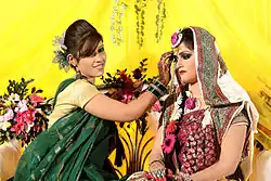 Bengali weddings are traditionally in five parts: first, it is the bride and groom's Mehendi Shondha (also called Pan Chini), the bride's Gaye Holud, the groom's Gaye Holud, the Biye, and the Bou Bhaat. These often take place on separate days. The first event in a wedding is an informal one: the groom presents the bride with a ring marking the "engagement" which is gaining popularity. For the mehendi shondha the bride's side apply henna to each other as well as the bride, for the bride's Gaye Holud, the groom's family – except the groom himself – go in procession to the bride's home. Bride's friends and family apply turmeric paste to her body as a part of bride's Gaye Holud, and they are traditionally all in matching clothes, mostly orange. The bride is seated on a dais, and the henna is used to decorate the bride's hands and feet with elaborate abstract designs. The sweets are then fed to the bride by all involved, piece by piece. The actual wedding ceremony "Biye" follows the Gaye Holud ceremonies. The wedding ceremony is arranged by the bride's family. On the day, the younger members of the bride's family barricade the entrance to the venue and demand a sort of admission charge from the groom in return for allowing him to enter. The bride and groom are seated separately, and a Kazi (authorized person by the government to perform the wedding), accompanied by the parents and a Wakil (witness) from each side formally asks the bride for her consent to the union, and then the groom for his. The bride's side of the family tries to play some kind of practical joke on the groom such as stealing the groom's shoe. The reception, also known as Bou-Bhaat (reception), is a party given by the groom's family in return for the wedding party. It is typically a much more relaxed affair, with only the second-best wedding outfit being worn. This is more or less the Muslim wedding procession. The Hindu weddings also follow the same parts of the wedding but the wedding part is somewhat different. The wedding is done along with a feast and according to the Hindu religion's wedding steps, e.g. Shat-pake-badha; Shidur Daan etc. the wedding most likely lasts the whole night starting at the evening. The Christian and Buddhist Wedding follow a totally different Process. They more or less follow Western Culture and Methods. Sometimes they too follow the Bengali wedding procession.