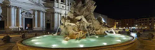 Fontana dei Quattro Fiumi (Fountain of the Four Rivers) is a fountain in the Piazza Navona in Rome, Italy. It was designed in 1651 by Gian Lorenzo Bernini for Pope Innocent X whose family palace, the Palazzo Pamphili, faced onto the piazza as did the church of Sant'Agnese in Agone of which Innocent was the sponsor.