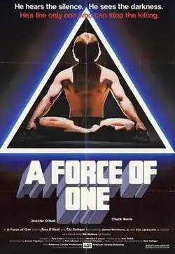 A Force of One is a 1979 American martial arts action-thriller film directed by Paul Aaron and starring Chuck Norris, with Jennifer O'Neill, Ron O'Neal, Clu Gulager, and martial artist Bill Wallace in his film debut.[5] Norris plays karate champion Matt Logan, who is hired to assist an anti-narcotics police unit, who are being targeted by a killer. The screenplay by Ernest Tidyman was based on a story co-written by martial artist Pat E. Johnson.