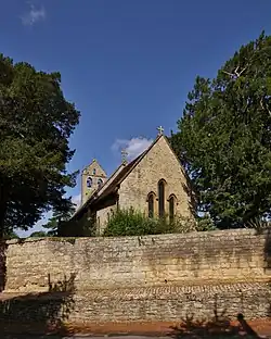 The church was rebuilt in the 13th century in the transitional style from Norman architecture to the Early English Gothic style: the lancet windows on both sides of the chancel and the gabled bellcote at the west end of the nave date from this rebuilding. Later the present west window was added in the Perpendicular Gothic style. In the same period a south porch was built. Its inner door is Perpendicular, but the outer is transitional between Norman and Early English and has been re-set, presumably from where the Perpendicular doorway is now.[2] In 1639 buttresses were built against the west wall to support the bellcote.[3] The bellcote has two bells, cast in 1652.