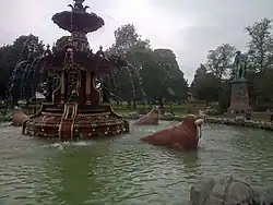 In the centre of the park an ornate fountain was constructed. The A listed fountain consists of dolphins, herons, cherubs and walruses. George Smith and Company of the Sun Foundry in Glasgow constructed the fountain. Stained-glass artist and designer Daniel Cottier was enlisted to paint and colour the monument.[5]
