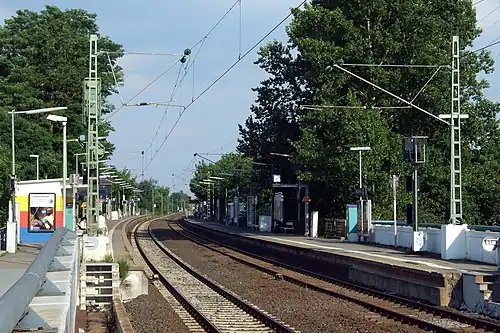 Frankfurt-Nied station is a station in the district of Nied of the city of Frankfurt in the German state of Hesse on the Main-Lahn Railway. It is now served only by lines S1 and S 2 of the Rhine-Main S-Bahn. The station is classified by Deutsche Bahn as a category 5 station.[1]