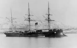 After the war, the French began drawing down their naval strength in the region, and Éclaireur and the cruiser Villars returned to France.[14] In 1888, the ship was dry-docked to have her boilers overhauled; work lasted into 1889.[3] In 1891, Éclaireur was stationed at Brest, along with the cruisers Forfait and Nielly and the coastal defense ships Fulminant and Tempête. The ships were mobilized in June to take part in limited training exercises.[15] The ships were kept in commission for the mandatory 28 days, and were sent to sea individually for training; no organized maneuvers were held that year.[16]