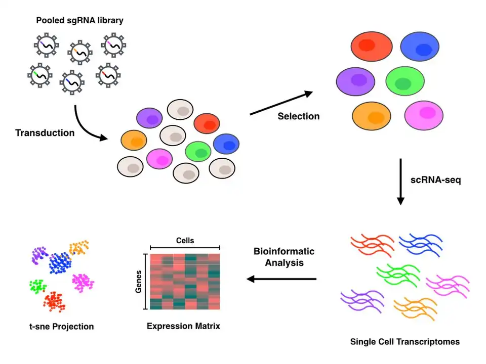 Perturb-seq couples CRISPR mediated gene knockdowns with single-cell gene expression. Linear models are used to calculate the effect of the knockdown of a single gene on the expression of multiple genes.