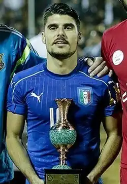Gori recovered from knee surgery in time to be included in the Italian team for the 2011 FIFA Beach Soccer World Cup on home sand in Ravenna,[3] but suffered at the tournament with a fever.[6] At his next World Cup appearance in 2015, he scored his 100th goal for Italy during the semi-final defeat to Tahiti,[7] ending the tournament as its joint second top scorer.[8] Later that summer, he scored four of Italy's five goals in the gold medal match of the Mediterranean Beach Games versus Egypt,[3][9] securing Italy's first major honour for ten years.[10] After earning his 100th cap for Italy in September 2016,[11] Gori was then voted as one of the three best players in the world at that year's annual season-ending Beach Soccer Stars awards ceremony[12] and also won the Pallone Azzurro (Blue Ball) award for best Italian player of the year bestowed by the Italian Football Federation.[13] His biggest individual accolade came six months later at the 2017 World Cup, where he won the Golden Boot (top scorer) with 17 goals,[14] and his 12 goals during the 2018 EBSL season helped Italy secure their first European crown in 13 years, the biggest title of Gori's career.[10]