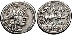 Denarius minted by Gaius Cato in 123 BC. On the obverse is Roma, while the reverse shows Victoria driving a biga.[1]