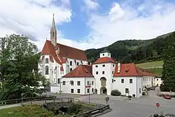 In 1330, Duke Albert II of the Habsburg family got the endowment to form a charterhouse in Gaming.[11] However, on 15 August 1332, the cornerstone for the Kartause was laid i.e., few years later.[11] The Kartause Gaming was called "Mariathron", which means "Mary, Throne of Christ".[12] It was intended to be a Carthusian monastery, his residence and the burial place for his family.[13] The remains of Duke Albert, his wife, and his daughter-in-law are still in the crypt of the Kartause today.[14]