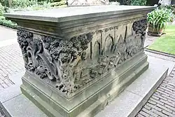On the east side of the tomb is carved the family arms, on the west side a skull and a seven-headed hydra, on the south side broken columns, Corinthian capitals, a pyramid and ruins, and on the north side shells, a crocodile, and a view of some Egyptian buildings.[17]
