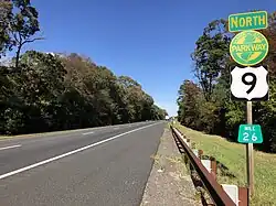 The parkway serves as a major route connecting North Jersey with all of the state's shore points, and as such, is subject to frequent congestion. The number of lanes on the parkway ranges from four in Cape May, Atlantic, and Bergen counties, to 15 on the Driscoll Bridge. Much of the highway runs closely parallel to, or concurrently with U.S. Route 9.[3] The speed limit on the parkway is 65 mph (105 km/h) for most of its length. However, it is posted at 55 mph (90 km/h) on a five-mile (8.0 km) section near Toms River and on a 40-mile (64 km) section between Sayreville and Paramus.[3] The NJTA may temporarily reduce the speed limit when special hazards exist.[4] Commercial trucks with a registered weight of over 10,000 pounds (4,500 kg) are not allowed to use the parkway north of exit 105, just past the Asbury Park Toll Plaza.[5] The entire length of the Garden State Parkway carries the unsigned designation of Route 444,[1] and is part of the National Highway System,[6] a network of roads important to the country's economy, defense, and mobility.[7]