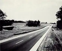 Plans for the Garden State Parkway date back to 1942, where it would have connected to the Palisades Interstate Parkway in Fort Lee.[11] Following World War II, traffic increased substantially on highways along the New Jersey coast. Due to the high traffic volume and presence of numerous traffic lights, it took motorists over three hours to travel between Paterson and Atlantic City. In 1946, plans were changed to construct a high-speed parkway to provide a bypass of Route 4, which, prior to 1953, ran from Cape May north to the George Washington Bridge by way of Paterson, largely following present-day U.S. Route 1, U.S. Route 9, and Route 35.[12][13] This highway would be constructed using state funds and be known as the Route 4 Parkway. Construction began in 1947, and the first section to open ran from Route 27 north to Cranford and opened on June 29, 1950.[14]