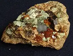 Spessartine or spessartite is manganese aluminium garnet, Mn3Al2(SiO4)3. Its name is derived from Spessart in Bavaria.[3] It occurs most often in skarns,[3] granite pegmatite and allied rock types,[23] and in certain low grade metamorphic phyllites. Spessartine of an orange-yellow is found in Madagascar.[24] Violet-red spessartines are found in rhyolites in Colorado[21] and Maine.