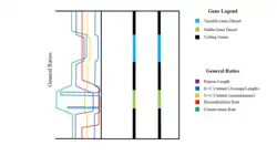 While stable gene deserts have higher GC content, this relative value is only an average. Within stable gene deserts, although the ends contain very high levels of GC content, the main bulk of the DNA contains even less GC content than observed in variable gene deserts. This indicates that there are very few highly conserved regions in stable gene deserts that do not recombine, or do so at very low rates.[6] Given that the ends of the stable gene deserts have particularly high levels of GC contents, these sequences must be extremely conserved. This conservation may in turn cause the flanking genes to also have higher conservation rates. Thus, stable genes should be directly linked to at least one of their flanking genes and cannot be separated from coding sequences by recombination events.[1] Most gene deserts appear to cluster in pairs around a small number of genes. This clustering creates long loci that have very low gene density; small regions with high numbers of genes are surrounded by long stretches of gene deserts, creating a low gene average. Therefore, the minimized probability of recombination events in these long loci creates syntenic blocks that are inherited together over time.[1] These syntenic blocks can be conserved for very long periods of time, preventing loss of essential material, even while the distance between essential genes may grow in time.