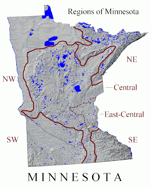 The subregion of East Central Minnesota is that part of Central Minnesota near the junction of three of the state's great rivers. Included are Dakota County, eastern Hennepin County, and the region north of the Mississippi but south of an east-west line from Saint Cloud to the St. Croix River on the Wisconsin border. It includes much of the Twin Cities metropolitan area.[45] The region has the same types of glacial landforms as the remainder of Central Minnesota, but is distinguished by its bedrock valleys, both active and buried.