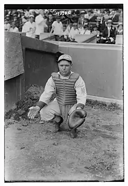 Gibson was a workhorse during his career with the Pirates, leading National League catchers in games played for four consecutive seasons between 1907 and 1910.[1] When Gibson began his major league career, most catchers were large, bulky men, however as baseball progressed during the Deadball era, the decrease in run production placed greater significance on stolen bases and bunts, which in turn emphasized the crucial defensive role played by catchers.[22] As the sport evolved, teams began to field smaller, more agile players as catchers, typified by the emergence of Ray Schalk.[22] A newspaper article of the day referred to Gibson as being part of the "dreadnought" type.[22] He suffered a broken ankle in late-April of 1913 and missed two months of the season.[23] Gibson returned to hit for a career-high .285 batting average in 102 games during the 1914 season.[1] In August 1916 the 36-year-old Gibson was placed on waivers and claimed by the New York Giants, but he refused to report that year.[24] Giants manager John McGraw persuaded him to join the Giants as a player-coach in 1917.[3] Gibson played in his final major league game on August 20, 1918 at the age of 38.[1]