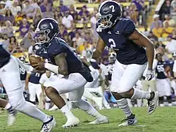 The uniforms consist of plain white pants, blue helmets with a white stripe down the middle and the player's number on the sides, and blue jerseys. This minimalist look was adopted more or less out of necessity. When the program was revived in 1982, the school did not have a large budget. Indeed, the equipment budget was so limited that only plain white practice pants could be purchased. Hence, the practice pants doubled as game pants. Russell bought solid blue helmets and had the players put a piece of tape down the middle.[27] With the subsequent success of the Eagles, the basic design has remained the same, with the only real changes in recent years being a white stripe down the middle of the helmets and the addition of names to the backs of the jerseys. Sports Illustrated has ranked the uniforms as being the third best in college football.