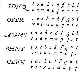 Bellaso challenged[1] his detractors to solve some cryptograms encrypted according to his guidelines. He also furnished the following clue to help the solution of one of them: ‘‘The cryptogram contains the explanation why two balls, one in iron and one in wood, dropped from a high place will fall on the ground at the same time.’’ This is a clear statement of the law of the free-falling bodies forty years before Galileo. The 1555 challenges were purportedly solved in 2018.[2][3] The seven 1564 challenges can be decrypted using the following keys: 1: MO-HUG, 2: DE-OTU, 3: QU-EHTBS, 4: SP-FXOT, 5: BA-TIS, 6: HR-DIS, 7: BARTOLMEUS-PANFILUS.