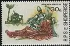 In Albanian folklore, Gjergj Elez Alia is regarded as a great warrior and his legend is one of the most popular. A song of Gjergj Elez Alia was recorded by Bernardin Palaj and Donat Kurti in Nikaj (Tropojë District) and published in Tirana in 1937.[27] The song is usually sung accompanied by the lahuta (gusle), or occasionally with çifteli, by the rapsod (performer of epic poetry).[28] The song of Gjergj Elez Alia is part of the heroic non-historical cycle of Albanian epic poetry, the Kângë Kreshnikësh ("Songs of Heroes"), however it is not related to the epic cycle of the pair of heroic brothers Muji and Halili.[29]