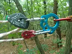 An aluminum loop with a spring-loaded gate used to attach various load-bearing climbing devices together.[1]