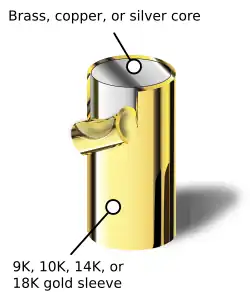 Gold-filled is a type of composite material. Composites are formed from two or more constituent materials with different properties that, when combined, create a new material with enhanced properties.[1] Gold-filled material is made by bonding a layer of gold alloy to a base metal core (typically brass, but sometimes copper or silver). This creates a material with the appearance and durability of solid gold, but at a lower cost.