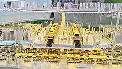 Scale model of Gongyuanqian Station at the Guangzhou Metro Museum, showing the perpendicular Spanish Solution interchange.