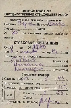 Commercial and developing economic activity required the reorganization of insurance, the restoration of which was carried out by the decree of the Council of People's Commissars signed by Vladimir Lenin on October 6, 1921 "On state property insurance",[3] which laid the foundations for the creation and development of state insurance. In the course of implementing this decree, the Main Directorate of State Insurance (Gosstrakh) was formed within the People's Commissariat of Finance of the USSR,[4] and state property insurance was resumed in the form of a state insurance monopoly.[5] The decree of October 6, 1921 prescribed "to organize in all areas of the RSFSR, both rural and urban, state property insurance of private households against the following natural disasters: fires, livestock death, hail damage to crops, as well as accidents on water and land transport routes".[5][6]