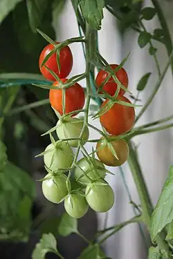 A grape tomato is a kind of tomato believed to be of southeast Asian origin, shaped similarly to the oval plum tomatoes but having the small size and some of the sweetness of cherry tomatoes. Grape tomatoes produce small and typically oblong fruits. Introduced to the worldwide market in the 1990s, they have gained substantial popularity, due at least in part to their higher sugar content compared to regular tomatoes, and due to their smaller, bite-sized shape.[1]