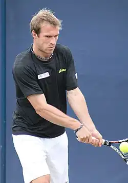 Grega Žemlja (born 29 September 1986) is a retired Slovenian tennis player. He won six singles titles and two doubles title on the ATP Challenger Tour. In 2012, he reached the third round of the US Open, the first Slovenian male player ever to reach that stage in a Grand Slam tournament. He is also the first Slovenian ATP player who in 2013 reached third round at Wimbledon. He reached his highest ATP ranking of world No. 43 in singles in May 2013, becoming the first Slovene ATP player to reach the top 50. Žemlja also became the first Slovene player earning over 1 million US dollars in prize money, and he was the highest-paid Slovene player in history until he was passed by Blaž Kavčič. He represented his country as a member of Slovenia Davis Cup team.