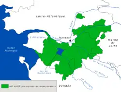 The appellation area overlaps closely with that of Muscadet.[2] Its terroir extends across the entire Nantes vineyard, from Ancenis to Pornic, with two more important production centers: the eastern Sèvre-et-Maine region (Le Loroux-Bottereau and Vallet) and the Logne, Boulogne and Herbauges regions (Corcoué-sur-Logne and Saint-Philbert-de-Grand-Lieu). The preferred area for Gros-plant is the Pays de Retz.[11] This appellation zone comprises 92 communes, including 69 communes in Loire-Atlantique, 16 communes in Maine-et-Loire and 4 communes in Vendée.[15]