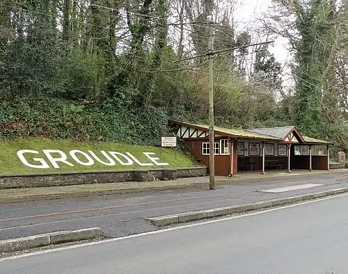 The station was the first terminus of the line in 1893, the following year an extension was opened as far as Laxey and the station became an intermediate one. The building that still occupies the site, consisting of a large open waiting shelter incorporating small ticket office in one corner, dates from the beginning of the railway, but has been unstaffed for many years save for occasional special events. Despite its somewhat basic appearance and lack of facilities, the station was one of the most popular on the line, serving the glen which operated as pleasure grounds, the adjacent hotel and nearby narrow gauge railway. The hill figure next to it reading "GROUDLE" was placed next to the shelter in 1993 for the centenary celebrations, a similar sign featured on the opposite hillside prior to the growth of trees planted for the glen's opening. The site is illuminated for evening service by two lamps affixed to the traction poles of the railway, unusually in brown to match the station rather than traditional green. One of the tramway's electrical sub-stations is a short distance from the stop just prior to the curve which leads to Groudle Viaduct. Beside what is now the entrance to the glen once stood Dobie's refreshment room, the site is now occupied by a private dwelling.