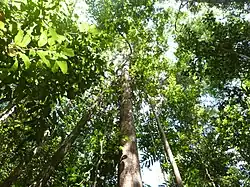 Tropical forest covers most of the territory of the Park where the number of vascular plants present is estimated at between 4,000 and 5,000 species (including more than 1,000 trees), or a tenth of the world's plant biodiversity.[13] The tallest trees such as the Hura crepitans and Ceiba pentandra can reach 55 to 65 meters in height.[14] A single hectare of forest frequently contains more different species of trees than the entire flora of Metropolitan France.[13]