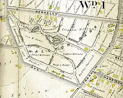 Halcyon Park is an unincorporated community that was developed by Reverend Cyrus Kemper Capron in Bloomfield, in Essex County, in the U.S. state of New Jersey, in 1895[1] as a planned community of homes with trees and shrubs, picturesque cottages, ponds and common grounds to be maintained by a caretaker and gardener. It is believed that Halcyon Park was inspired by Llewellyn Park,[2] the first planned garden suburb about three miles away. Capron envisioned a private residential park for individuals of moderate means to offer all the advantages of the city (proximity to two railroads and a trolley for access to Newark and New York City, water, gas, sewer and paved streets) and the country (trees, ponds, picturesque landscape).[3] The original plan laid out 182 lots and common grounds to include a club house and tennis courts for common use by a lot-owners association.[1] The Club House contained a bowling alley, billiard table, library and stage. The common grounds included a gate house, a conservatory, and two ponds. The land was developed with water, sewer and gas lines and paved streets, innovative at the time.