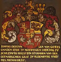John was born on 25 March 1545 at Koldinghus Castle in Jutland, Denmark as the fourth child and third son of King Christian III of Denmark and Norway and his wife, Dorothea of Saxe-Lauenburg.[2][3] When Christian III died in 1559, he left three sons. Where the eldest, Frederick II, had long ago been appointed successor to the thrones of Denmark and Norway, all three brothers were in principle equally entitled to the father's share of the duchies of Schleswig and Holstein. To avoid unfortunate divisions of the royal part of the duchies, attempts were made to find suitable positions for the younger brothers elsewhere. The middle brother, Magnus, consequently, gave up his right of inheritance when Frederick II had him placed as prince-bishop of Ösel-Wiek in Livonia.
