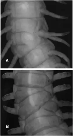 8. ^ a b "MORPHOLOGICAL ANOMALIES IN HAPLOPHILUS SUBTERRANEUS (SHAW, 1794) (CHILOPODA: GEOPHILOMORPHA)" (PDF). Bulletin of the British Myriapod & Isopod Group. 26: 54–55. 2012. Archived from the original (PDF) on 13 Jan 2023.