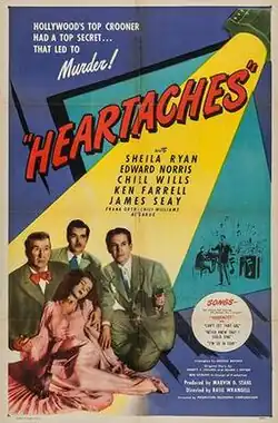 Heartaches is a 1947 American crime film directed by Basil Wrangell and written by George Bricker. The film stars Sheila Ryan, Edward Norris, Chill Wills, Kenneth Farrell, James Seay, Frank Orth, Chili Williams and Lash LaRue. The film was released on June 28, 1947, by Producers Releasing Corporation.[1][2][3]