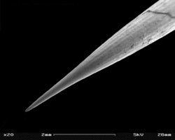 Close-up of the last 5 millimetres (0.20 in) of a hedgehog spine (SEM microscopy)
