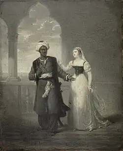 Over a period of about 30 years in England, Fradelle exhibited 36 pictures at the British Institution,[4] including The Cloister of the Carthusians at Rome Built by Michael Angelo; The Porch of St. Ambrose at Milan; Chatelar Playing the Lute to Mary Queen of Scots; Belinda at Her Toilette; The Earl of Leicester's Visit to Amy Robsart at Cumnor Place; Ivanhoe, Queen Elizabeth and Lady Paget; Origin of Painting; Souvenirs d'Italie—Il Sospiro, an Italian Dance; and Othello and Desdemona.