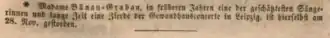 In 1837, she married the merchant Julius Alexander Bünau (1809-1871); in 1838 her daughter Helene (d. 1893) was born. Helene Grabau-Bünau gave her last official concert on 21 March 1839, but she still performed occasionally in the 1840s, for example at charity concerts and on special occasions: in 1841 in the Wenzelskirche in Naumburg at the pre-celebration of the birthday of King of Prussia,[4] 1843 in the premiere and revival of Robert Schumann's Paradise and the Peri op. 50 in Leipzig[5] and in the same year at the unveiling ceremony of the Altes Bach-Denkmal in Leipzig. [6] Henriette Grabau-Bünau also took part in the commemoration of Mendelssohn's death on 4 November 1847.[7]