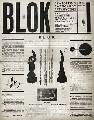 At Blok, Stażewski collaborated with Henryk Berlewi and Szczuka who were considered leading figures in Polish avant-garde typography. After Blok was dissolved in 1926 due to internal disagreements, Stazewski became one of the co-founders of the avant-garde collectives Praesens (1926–1929) and later a.r. group (1929–1936), both of which also became critical in defining the direction of Constructivism in Poland.[8] As a member of these groups, Stażewski contributed to Polish Constructivism through typography, posters, theoretical writings (including publications for the Blok magazine published between 1923 and 1926), as well as interior design and furniture design.[12] Though predominantly idealistic and of limited impact on the Polish post-World War I society, the Constructivists completed some important architectural projects (Praesens, for instance, participated in the design of apartment buildings for the Warsaw Housing Cooperative in the Rakowiec district)[10]: 123–124  and imbued the Polish avant-garde, up until then largely autonomous, with a sense of social commitment.[10]: 128